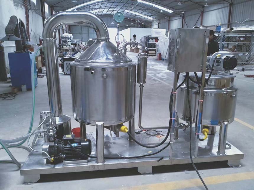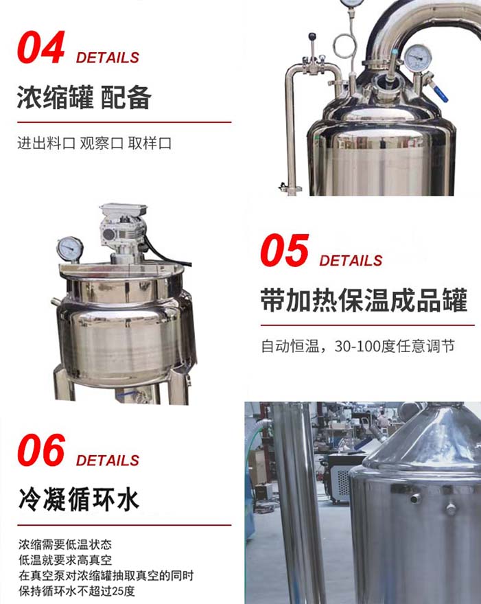 3 、預(yù)熱罐、濃縮罐的夾層內(nèi)加滿水,以防加熱器干燒;夾層出氣口嚴禁封閉;接好冷凝器的冷卻水管,冷卻水底進高出。